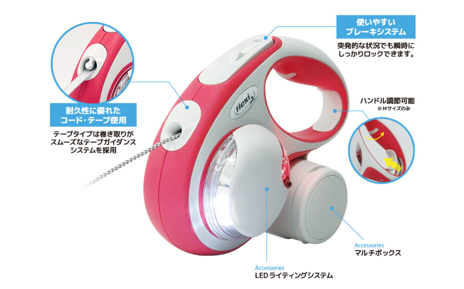 スムーズな巻き取りと耐久性・安全性を追求したフレキシ社の伸縮リード。
